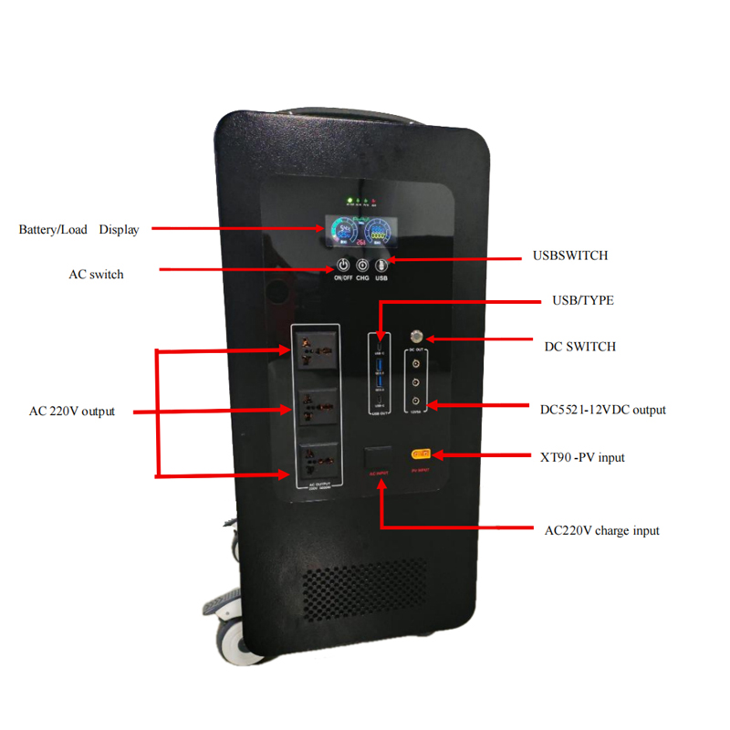 - AC220V discharge: continuous 3KW output; AC220V charging: 1000W 5A.